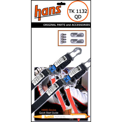 Two fixed quick disconnect HANS tethers. Contains webbing material, shackles and metal catches. Easily attaches to any device.